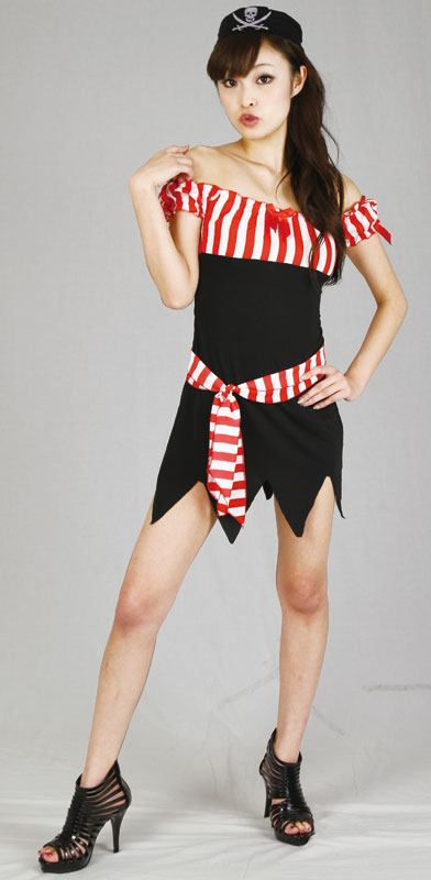 際どいスカートの裾からチラリと見えるのはTバック!セクシーかつクールにキメる、女船長コスチューム!タイトな印象の黒地のワンピースは肩出しのパフスリーブ仕様、バスト周りはふんわり赤と白の太めストライプ。 胸元と袖口には赤いリボンを施しキュートに!ウエストにはバスト周りと同じ、赤白ストライプ柄のベルトスカーフを巻いてオシャレに!ドクロの描かれた帽子を被って、パイレーツ気分で仮装パーティーやイベント会場で暴れちゃおう! ※サイズはおおよその目安となります。 表記のサイズを基準に前後でお考え下さい。