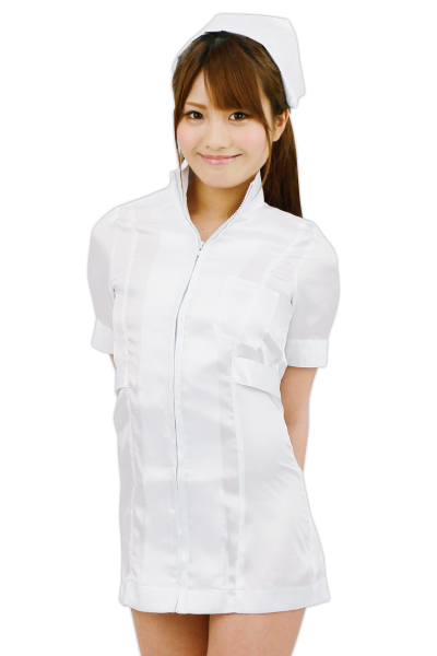 セクシーな白衣の天使になれちゃうミニ丈ナース服コスプレ。 タイトな半袖ワンピースは、フロントのファスナーで胸元の露出度を調節可能!もちろんナースキャップもセットです。 ちょっぴり刺激的なお医者さんごっこにもぴったりのセクシーコスチュームです。