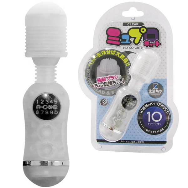 ノーマルヘッドを外すとブラシ型ヘッドが登場!二通りの使い方が出来る、コンパクトでキュートなミニ電マ(クリア)。 スイッチを入れるとLEDバックライトが点灯し、ムードある光を放ちます。 小さいボディに10種類ものバイブレーション機能を搭載。 マットコーティング加工を施して、汚れにくさと肌触りのよさの良いトコ取り!多様に遊べる小型電マです。 ボタン電池(LR44)×6個使用。