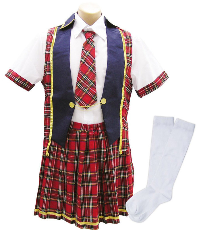 憧れの男の娘に変身!赤チェックが可愛いアイドルコスチュームに、メンズサイズが登場しました。 半袖ブラウス、ベスト、ネクタイ、スカート、ソックスの豪華一式セット!これならサイズが合わずに叶わなかった女装にもチャレンジできますね。