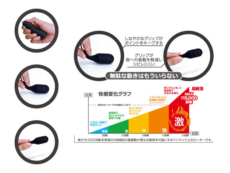 毎分15000回転が生み出す激しい絶頂感!最上級即逝きモード『激』搭載シングルローター。 微弱から、ボタン送りで5段階の振動調節が可能!強の上を行く強烈バイブレーションが楽しめる有線リモコンローターです。 振動で痺れにくいツマミグリップが使いやすい!マットなシリコン素材の柔軟性を生かして、当てたい場所を楽に刺激できます。 単四電池2個付き。