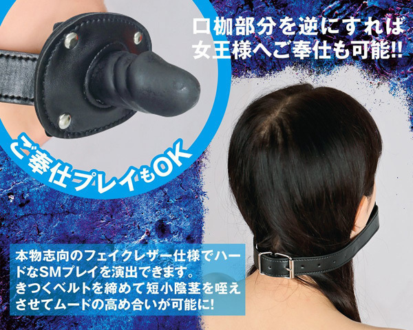 苦痛と快感を与える調教シリーズに新アイテム登場!超ミニなリアルディルド付き口枷。 ●口枷・短小陰茎ver●高級フェイクレザー素材を採用●奉仕プレイも可能なミニディルド付き●サイズ→ベルト調節可能。 パートナーの悶える姿を見たいならディルドをお口に…、ご奉仕プレイがご希望ならディルドを外側に向けて装着!様々なプレイを楽しめるSM調教グッズです。 別売りの同シリーズ「首枷(e22507)」と併用すれば、わんこプレイも楽しめます。