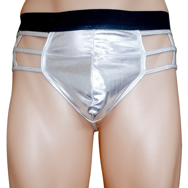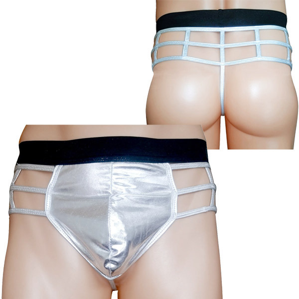 近未来的なデザインがCOOL!まるでショーの衣装のように華やかなキラキラ系男性下着。 ●シルバーに輝くメタリック風素材●ウエスト部分は幅広ゴムでぐるり●ベース型で覆う立体加工フロント●サイド〜バックにかけてネット状●ストリングのみのSEXYバック。 対極にある「隠す」と「見せる」をバランスよく釣り合わせたセクシー下着!目が眩みそうなシルバーのきらめきと肌見せ感で、男の色気をたっぷり引き出します。