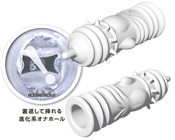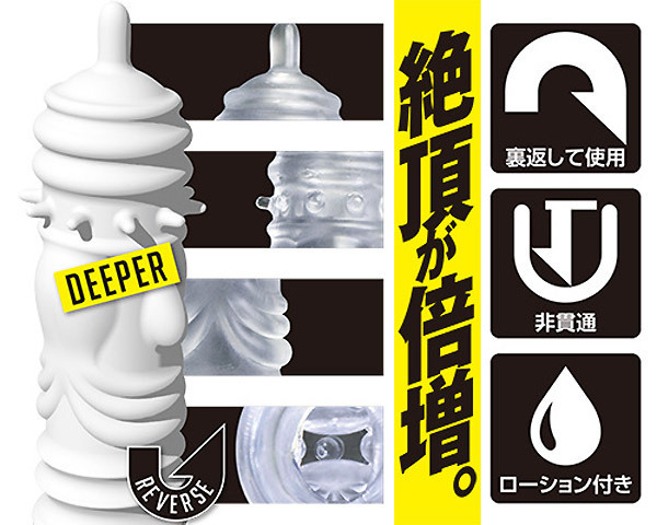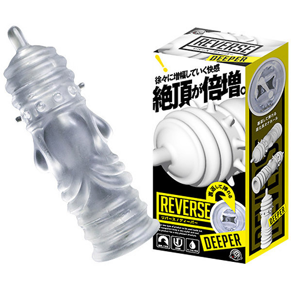 裏返して挿入するリバースシリーズ!多彩なギミックで刺激する進化系オナホール。 ●ペニスサック風クリアボディ●イボヒダ系ギミックの「DEEPER」●挿入時は裏返して突起を内側に●奥突きの度に先端突起が刺激●カリを360度刺激するイボ突起付き●裏返しやすいので洗浄も楽々。 リバース式だからこそ実現した複雑構造!まるでタコのような巨大イボ&ヒダなど、バラエティに富んだギミックがてんこ盛りのオナホールです。