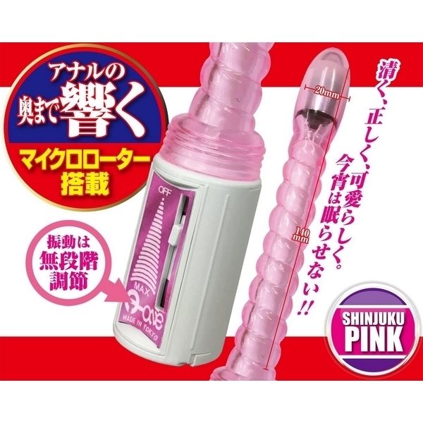 アナルトーキョーからシリアナ快感を世界へ!奥まで響くマイクロローターを搭載したスティック型アナルバイブ。 ●新宿ピンクカラータイプ●フレキシブルな柔軟ボディ●ポコポコ刺激のスクリュー型●挿入部約14cm、最大径約2cm●先端にマイクロローター搭載●奥まで届くパワフルな振動●振動調整は無段階スライド式●安心安全な日本製グッズ。 ぷっくりヘッドにパワフルモーターを搭載した、スリムなスティックフォルムの電動アナルグッズです。