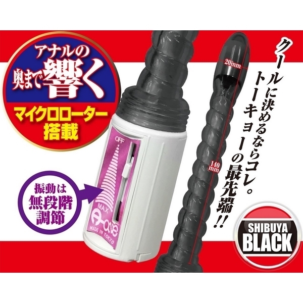 アナルトーキョーからシリアナ快感を世界へ!奥まで響くマイクロローターを搭載したスティック型アナルバイブ。 ●渋谷ブラックカラータイプ●フレキシブルな柔軟ボディ●ポコポコ刺激のスクリュー型●挿入部約14cm、最大径約2cm●先端にマイクロローター搭載●奥まで届くパワフルな振動●振動調整は無段階スライド式●安心安全な日本製グッズ。 ぷっくりヘッドにパワフルモーターを搭載した、スリムなスティックフォルムの電動アナルグッズです。