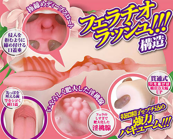 濃厚な舌使いとバキューム地獄で一網打尽!淫乱ベロ長女のクチま○こフェラオナホール「強吸引 長舌フェラペチーノ」。 ●口元をリアルに再現したフェラ系●根元までや優しく包むモチ肌素材●内部でベロベロうねる65mmの長い舌●超強力なバキュームフェラを実現●喉奥まで続くギミックラッシュ構造●甘噛み歯と硬めヒダの上顎も成型●いやらしく肥大した扁桃腺風イボ●極締め喉ちんこでディープスロート●メンテ性抜群!洗いやすい貫通式●底部の穴を塞げば吸引力が大幅UP。 リアル造形のフェラチオホールで強力バキュームのじゅるじゅるプレイをお楽しみ下さい。