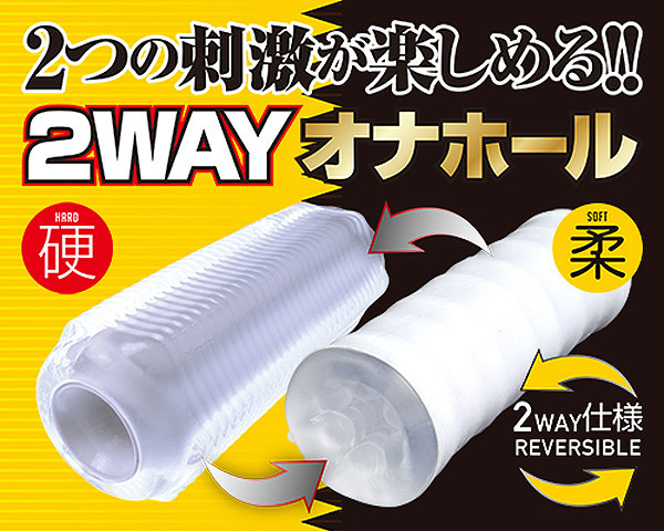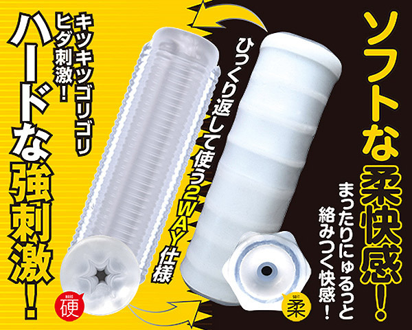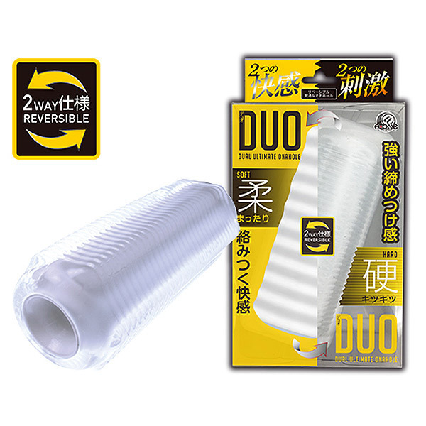 ソフトとハードの刺激をこれ一つで♪ひっくり返して使う両面仕様のリバーシブルオナホール「DUO(デュオ)」。 ●裏返して使うリバーシブルタイプ●ハード:クリア素材の細ヒダ構造●キツキツなゴリヒダの強刺激快感●ソフト:ふわふわ白素材の柔構造●にゅるっとまったり絡みつく快感●裏返しやすく洗浄しやすい貫通型。 気分に合わせて使い分け♪表と裏で異なる挿入感を楽しめる2WAY仕様のオナホール。 にゅるっと絡みつくソフトな快感と、ゴリヒダ刺激のハードな快感をお楽しみ下さい。
