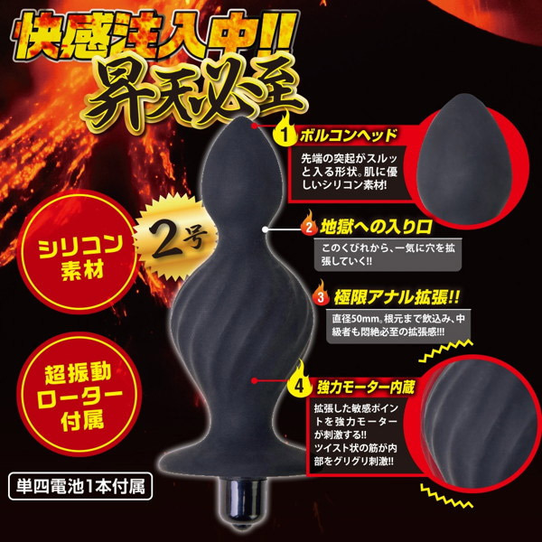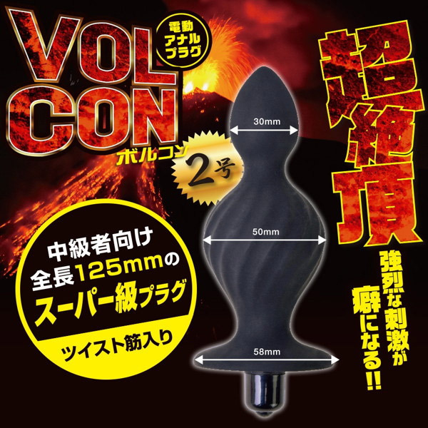 昇天必至の超強力ローター搭載!強烈な刺激が癖になる電動アナルプラグ「ボルコン2号」。 二段の膨らみを持つくびれボディはシリコン素材で滑らかな肌触り!表面にはツイスト筋を入れて刺激をプラス。 スルッと入る先端ボルコンヘッドの先にあるくびれを超えると、二つ目の大きな膨らみが腸内をみっちり満たします。 さらに、拡張した敏感ポイントに強力振動ローターが刺激を与える悶絶必至のアナル拡張グッズ。 中級〜上級者向けサイズの2号は全長12.5cm、最大径5cmとスーパー級の極太仕様です。 単四電池×1本付属。