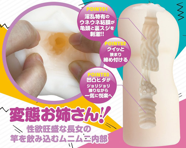 スケベ四姉妹と中出しSEX!性欲旺盛な変態お姉さん長女ユイの淫乱オナホール「おなシスタ01 結(YUI)」。 『おなガール』の血を受け継いだ新シリーズ『おなシスタ』が登場!竿を飲み込むムニムニの内部は、淫乱特有のうねうね粘膜が亀頭と裏スジを刺激!クイッと狭まり締め付ける中間部を抜けると、最奥の凹凸ヒダがジョリジョリと擦りながら一気に悦楽へと誘います。