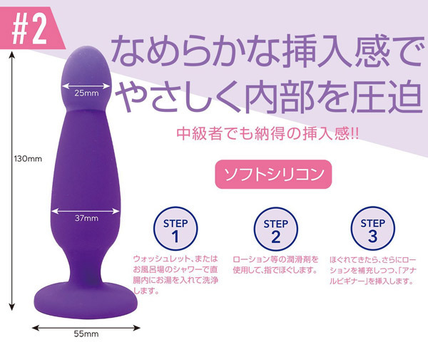 気軽かつ快適にアナルプレイ!挿入感抜群なしなやか素材のアナルプラグ「アナルビギナー #2」。 先端はやわらかなふにふに感触のソフトシリコンで挿入もスムーズ!胴体はなめらか&しっかりとしたシリコンで圧迫感を味わえます。 するんと入るシルキーヘッド&約3.7cmの最大径で中級者さんでも納得の挿入感を味わえるアナルグッズ!吸盤付きなのでお好きなところに固定してお使い頂けます。
