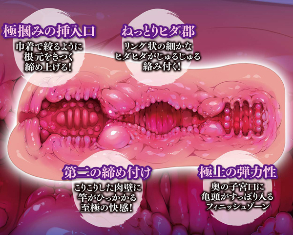最高の快感を与えてくれる女性器を名器と言いますが、こちらの名器百景 巾着は膣の入り口が狭い締まりバッチリな名器仕様のため、極上の膣内を手軽に体験できるのが特徴です。 挿入口からアナタのムスコをキツく締め上げ中央の締め付けゾーンで竿全体を刺激!ストロークごとに快感は高まり最深部の子宮口へ絶頂フィニッシュ。 竿の根本から先端まで巾着のように丸っと包み込む気持ち良さが特徴的な非貫通オナホです。 素材は伸縮性や耐久性が高く、洗浄もしやすいので繰り返し清潔にお使いいただけます!