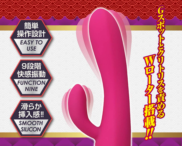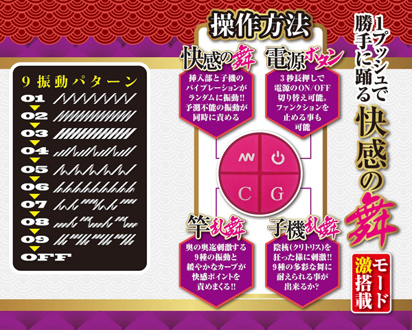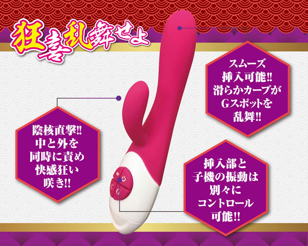 快感が乱れ舞う…快感絶頂バイブ!挿入部の先端と子機にローターを搭載しGスポットとクリトリスを同時責め。 9段階の振動パターンが刺激に彩りを与えます。 また予測不能な振動が楽しめる快感の舞モードを搭載し、さらに楽しくご使用いただけます。 なめらかシリコン製で挿入もとってもスムーズで潮吹き調教やGスポット開発にも便利!
