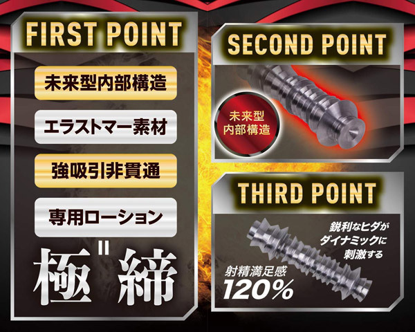 強吸引の刺激がマッハで射精を促す!鋭利なヒダの凸凹が生み出すダイナミックな刺激と極上の締め付けで亀頭に喰らい付き搾り取る。