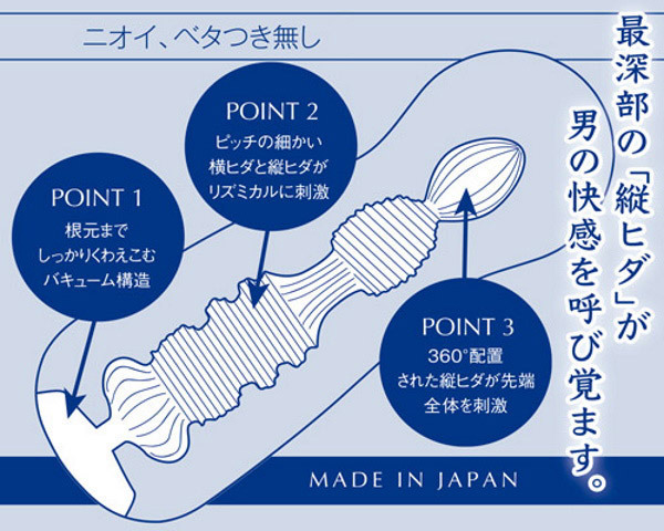 厚生労働省安全基準に合格の高品質の純国産素材「ウルトラマテリアル」を使用したことでニオイとベタつき感を極限まで無くし、しっとりと包み込む弾力感を実現。 今までとは違う上質な感触をご体感いただけます。 また、気泡によるクッション性が、人肌以上の弾力感を生み出しました。 最深部の「縦ヒダ」が男の感覚び覚ます「バブール エッジ」根元までしっかりくわえ込むバキューム構造に加え、ピッチの細かい横ヒダと縦ヒダがストロークの度に竿全体をリズミカルに刺激。 さらに最深部では360°配置された縦ヒダが亀頭全体を包みこんで刺激します。 付属ローションからホールまで、すべてが日本製。 ワンランク上の大人のオナホールで最高のひと時をお楽しみください。