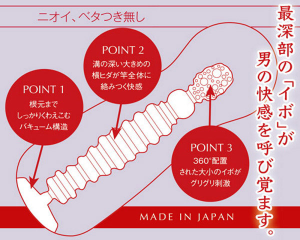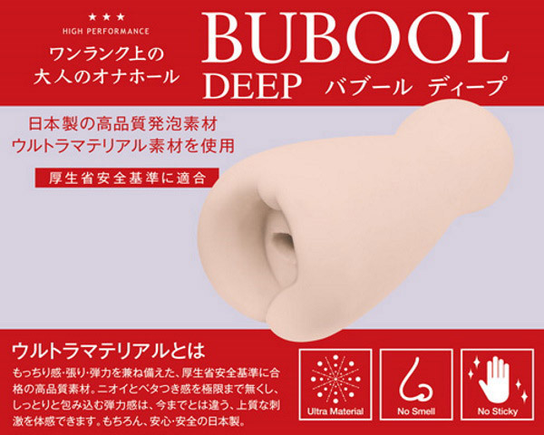 厚生労働省安全基準に合格の高品質の純国産素材「ウルトラマテリアル」を使用したことでニオイとベタつき感を極限まで無くし、しっとりと包み込む弾力感を実現。 今までとは違う上質な感触をご体感いただけます。 また、気泡によるクッション性が、人肌以上の弾力感を生み出しました。 最深部の「イボ」が男の快感を呼び覚ます「バブール ディープ」根元までしっかりくわえ込むバキューム構造に加え、溝の深い大き目の横ヒダが竿全体に絡みつき快感を与えます。 さらに最深部では360°配置された大小のイボ群が亀頭全体をグリグリと刺激します。 付属ローションからホールまで、すべてが日本製。 ワンランク上の大人のオナホールで最高のひと時をお楽しみください。