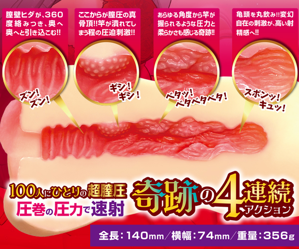 圧倒的な圧力で締め付ける!100人に1人しかいないという高膣圧感を再現した速射必至の非貫通オナホ。 サオが潰れそうなほどの強烈圧力!圧迫感の中に感じる柔らかな膣道を進むと、亀頭が丸々と飲み込まれ、変幻自在な刺激で射精へ一直線♪膣壁がサオに合わせて動くという高膣圧を再現した356gの肉厚オナホ。 ローション付