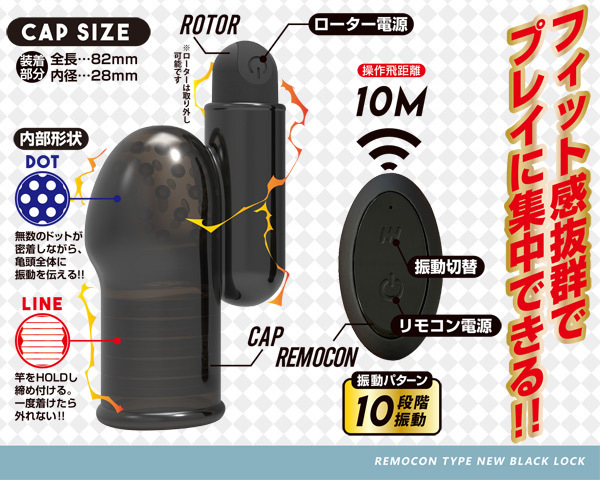 爆発的人気の亀頭責めローター「ブラックロック」シリーズ最新作!小型リモコンによる遠隔操作でハンズフリーで楽しめるUSB充電式ローター。 フィット感抜群のキャップ内には密着感を高めるドットと横溝を配置!サオをギュッと締め付けながら亀頭を細かに刺激する!振動は10段階搭載、操作飛距離は10mまで対応。 防水式でお手入れ簡単。