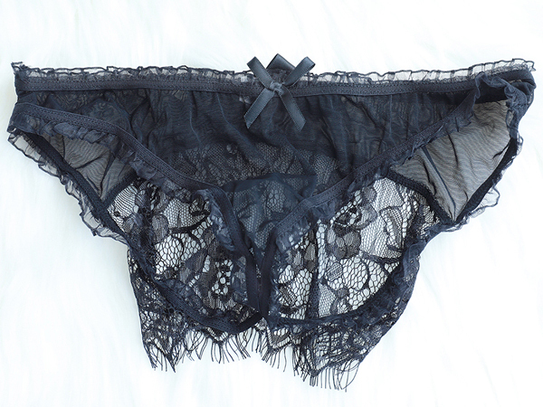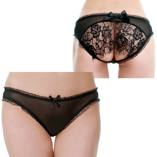フロントはちょっと大人しめなデザインながら、バックスタイルで挑発するキュートな透明感が楽しめる刺繍デザインが魅力のプレイショーツ。 ブラックのシースルー生地をベースに、フリルを使ったトリミングやリボンの装飾がカワイイ感じを演出してくれるフルバックタイプのショーツで、フロントとバックの印象が大きく違う二面性が楽しめます♪大きくラウンドカットされたヒップサイドには大きめなサテンリボンと、優雅なフローラルレースで装飾され、かなり大胆なデザインになっています! ※刺繍などのデザインが異なる場合がございます。 濡れたままの保管は色移りの原因になります。