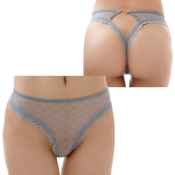 ラブリーなハート模様を控えめに魅せるデザインがポイント!グレー系のカラーメッシュ素材の透け見える感じで大人っぽさもあるTバックショーツ。 ベースとなるメッシュ生地には小さなハート柄が入っていて、トリミングのレース使いや、深めのレッグカットが美脚なシルエットも演出してくれるショーツです♪フロントはやや大人しめなデザインですが、バックにはダイヤ型のカットアウトが入っており、トップにはゴールドのハートモチーフがアクセッぽくキラリと輝いて視線を惹きつけます! ※刺繍などのデザインが異なる場合がございます。 濡れたままの保管は色移りの原因になります。