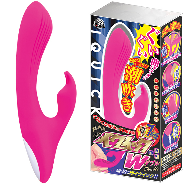 Gスポを的確に捉えるミドルサイズのバイブ「イクイックW(ダブル)」。 ぐいぐい自由に曲げられるフレキシブルボディにクリを挟むことができるクリ用子機も付いた贅沢仕様のバイブです♪持ち手のグリップが短いのでハンドリングしやすく、挿入部分を自在に曲げられるフレキシブルシャフトが特徴となっています。 膣内にも優しくなじむシリコン製で肌触りはソフトでなめらか♪子バイブは先端のバイブと連携しているので強弱含んだ7パターンの振動が楽しめます。 使用後も洗えて清潔で安心!Gスポットを刺激しながらクリトリスも刺激するなどノンストップでの潮吹きも楽しめちゃいます♪優しさと激しさと心強さを兼ね備えた潮吹きバイブ!生活防水仕様なので丸洗いできて衛生面でも安心です♪電源はUSB充電式でフル充電60分で連続使用約55分。