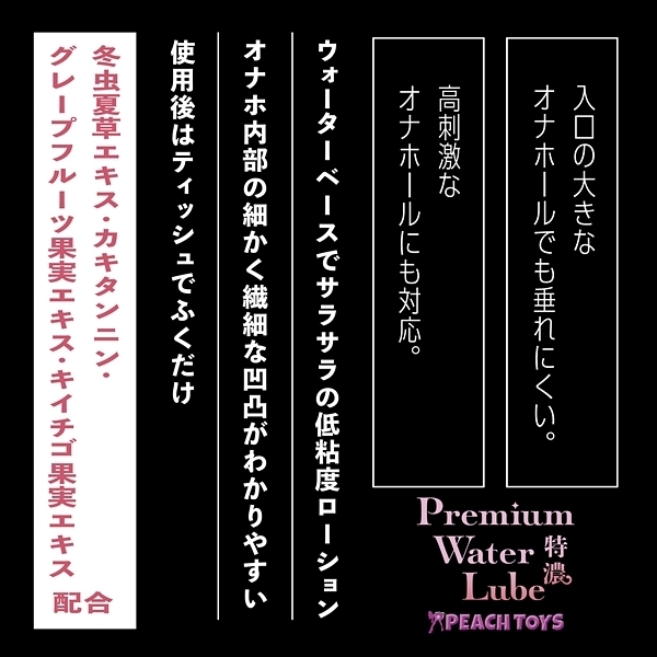 『水のように滑らか、でもヌルヌル感持続!ふき取るだけでOK!』「ふくだけローションPremium Water Lube (180ml)」が、ラベルデザインと容量・成分をリニューアルして再登場です!白いポンプの「ふくだけPWL 特濃」は、【低粘度+濃厚な液体】入口の大きなオナホールでも垂れにくい。 高刺激なオナホールにも対応。 冬虫夏草エキス・カキタンニン・グレープフルーツ果実エキス・キイチゴ果実エキス配合●ウォーターベースでサラサラの超低粘度ローション●オナホ内部の細かく繊細な凹凸がわかりやすい●使用後はティッシュでふくだけ簡単●無香料●安心の日本製●500ml 特濃 <成分>水、プロパンジオール、ヒドロキシエチルセルロース、乳酸、キサンタンガム、ローヤルゼリーエキス、アルギニン、マカエキス、水溶性コラーゲン、グリチルリチン酸2K、ローズマリーエキス、モモ葉エキス、カキタンニン、銀、フユムシナツクサタケエキス、クエン酸、クエン酸Na、BG、エタノール、セルロースガム、炭酸水素Na、フェノキシエタノール、EDTA-2Na、ブチルカルバミン酸ヨウ化プロピニル
