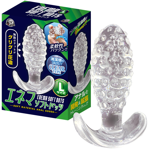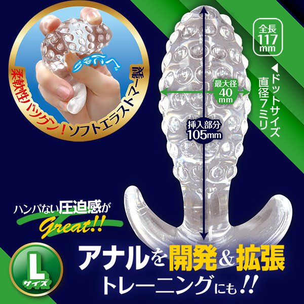 表面に配置された無数のドットイボによる圧迫感が心地良い「エネマソフトドッツL」です♪アナルの開発や拡張に最適なプラグで、開発レベルに合わせて3サイズから選ぶことができます。 素材はソフトエラストマー製で柔軟性も抜群!挿れやすくて抜けにくく、丸洗いもできて何度も使用OK♪使いやすいストッパー付きでとっても安心!見た目も美しいクリアタイプのアナルプラグでこちらはLサイズ♪ハンパない圧迫感にアナルもびっくり!圧倒的な大きさをぜひお楽しみください♪