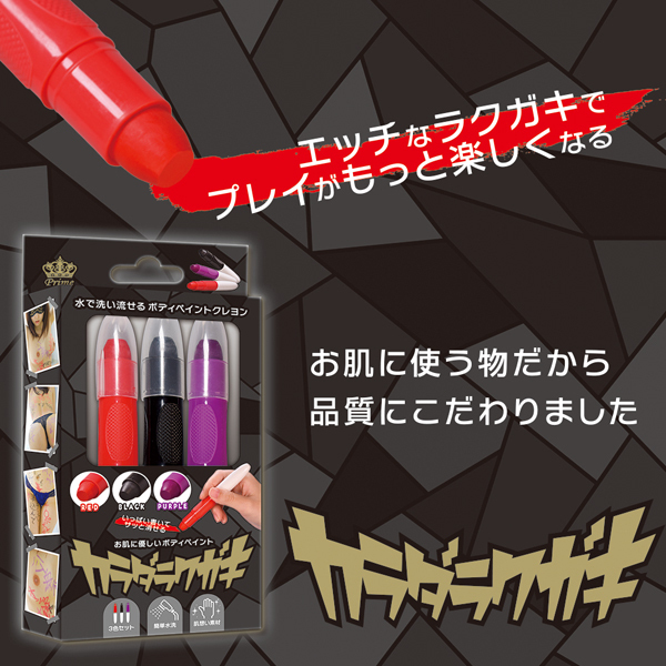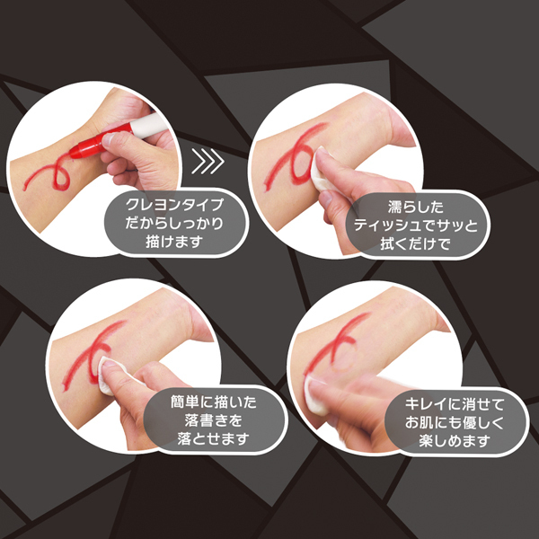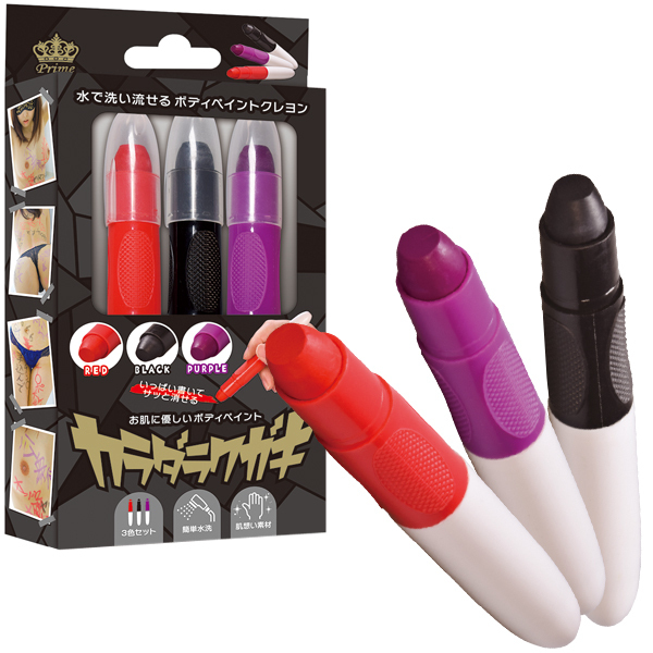 卑猥な言葉を全身に落書き!仮装用にも使えるボディペイント用クレヨン赤黒紫の3色セット。 肉便器、性奴隷、発情中などなど好きな凌辱ワードを身体に書いてプレイを盛り上げよう!パートナーとはもちろん、一人で使っても興奮高まる♪素材は肌に優しい水性素材仕様で、濡れた布で拭き取るだけで簡単綺麗さっぱり!ハロウィン仮装のペイントにも◎