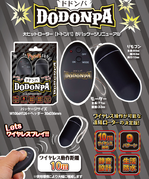 ワイヤレスプレイがめっちゃ楽しい大ヒットエスパーローター<ドドンパ>がパッケージリニューアルしました。 外責めにも挿入にも適した使い勝手の良い大きめエッグローターにハイパワー振動!10m以上(使用環境により大幅に増減します)のワイヤレス操作が可能な遠隔ローターの決定版!操作しやすい薄型リモコンには持ち心地の良いマットコーティング加工。 実用性・使用感・性能にこだわったドドンなパーティーローター。