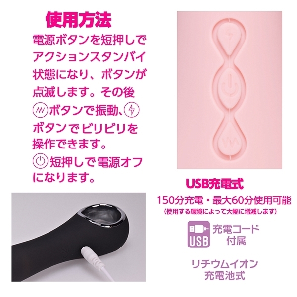 ビリビリ低周波が刺激的な話題の膣トレバイブ、心地良いビリビリに強力な振動で他では味わえない快感を楽しめます。 シンプルなストレート形状に肌心地の良い高品質マットシリコンで滑らかな感触。 IPX7の完全防水性能だからしっかり洗えて衛生的に遊んで頂けます。 振動・ビリビリ刺激は個別に操作が可能で、ビリビリ7パターン。 振動12パターン。 150分充電で最大60分使用可能(使用環境によって大幅に増減します)●カラー:ピンク