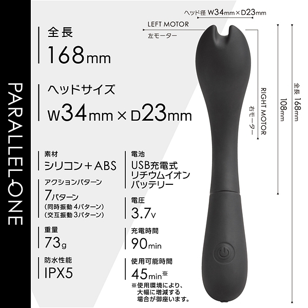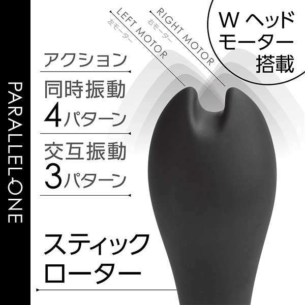 先端に並列で2つのモーターを搭載して、個別に振動させる事が出来るツインモータースティックです。 滑らかな肌心地のシリコン素材と振動の質にこだわったモーターを2機搭載。 プレジャースポットに合わせた角度と日本人に合ったサイズ感が特徴です。 先端は挟んで刺激も出来るように溝を付けています。 先端振動は同時振動・個別振動合わせて7パターン。 90分充電で最大45分使用可能(使用環境により大幅に増減します)なパワフルなリチウムイオンバッテリーを搭載。 IPX5の高レベル防水でしっかり洗えて衛生的です。 スマートに振動を楽しめるWモーターヘッドスティックです。 ●カラー:ブラック