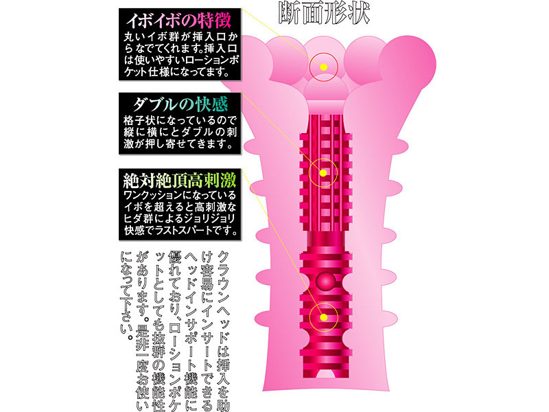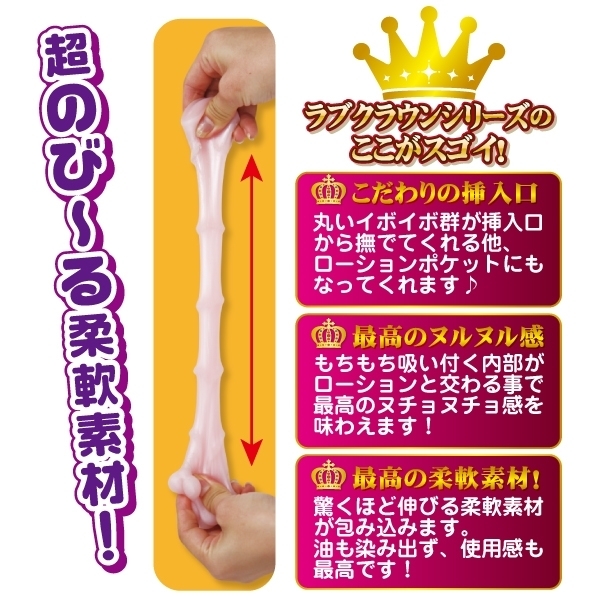 こんなによく伸びるホール見たことない!最大約92cmも伸びる、超もっちり柔軟素材のオナホール(非貫通型)。 内部は格子状で縦横から波のように刺激します。 最奥直前にあるイボを超えると横ヒダが出現し、絶頂へ導く高刺激を送ります。 ローションポケットにもなるイボイボ群のヘッドインサポート形状で、勃ちにくい時も根元まで挿入を手助けしてくれる次世代オナホールです。
