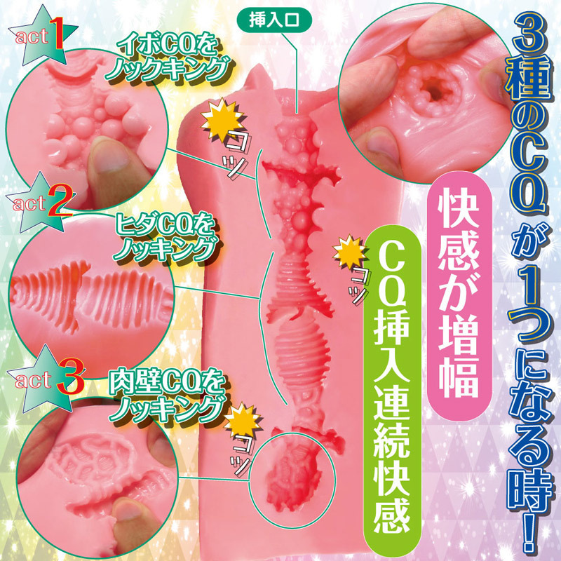 3つのCQ(子宮)を亀頭でノック!異なる快感を一つにまとめたトリプル構造オナホール。 ●子宮を体感できる「CQ」シリーズ●むちっと高弾力な肉厚ボディ●嫌な臭いを抑えたバンジータッチ素材●イボ・ヒダ・網目ヒダのトリプルCQ構造。 亀頭でノックしながら奥へと進む度に新たな刺激が襲い掛かるトリプル構造!柔らかくも高弾力な素材の適度な締め付け感に、何度でもストロークしたくなるオナホールです。