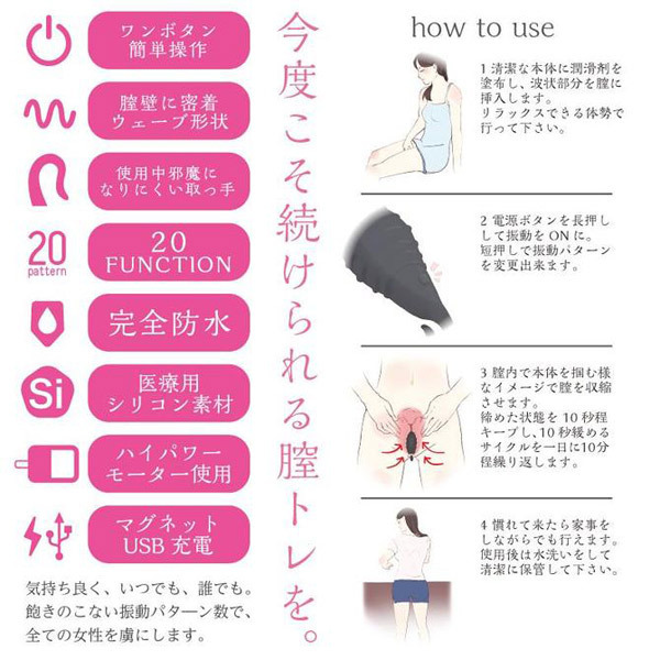 いつでも誰でも、ずっと気持ちイイ♪膣圧を向上して『極上名器』に変身させる膣トレグッズ「ウェービーオルガ ホワイト」。 膣壁に密着するウェーブ形状のデコボコした表面の構造が、男性を虜にする名器に変身させます。 こまめに挿入してトレーニングすることで徐々に膣圧アップ!取り出しやすいスマートな取っ手は邪魔にならないので、普段の生活をしながらでもトレーニング可能。 強さが選べる20種類もの振動パターンを搭載!ボタン一つの簡単操作で異なる刺激を堪能できます。 また、トレーニングだけでなくクリバイブとしても快感を得られるハイパワーモーター仕様です。 本体の充電は簡単なマグネット式USB充電(専用ケーブル付属)、完全防水仕様、医療用シリコン製。