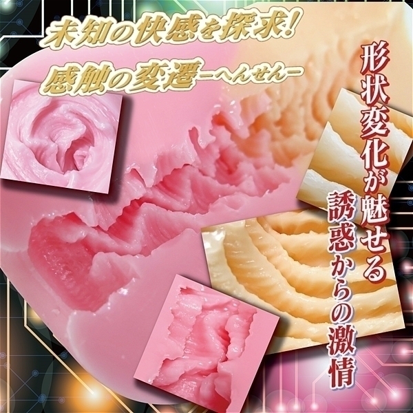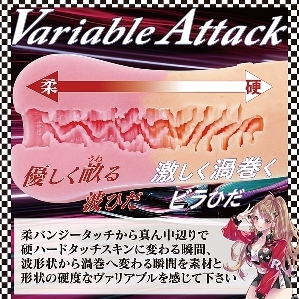 ヴァリアブルアタック:革新の触感テクノロジー、ツートン素材が魅せる感覚のダイナミズム!二つの世界を一つで感じるデュアルフィーリング。 柔から硬に変わる瞬間、波形状から渦巻へ変わる瞬間を素材と形状のヴァリアブルを感じて下さい。 形状変化が魅せる誘惑からの激情、硬度変化がおりなす心躍るアメージング体感。 未知の快感を探求!感触の変遷(へんせん)を是非お試し下さい。