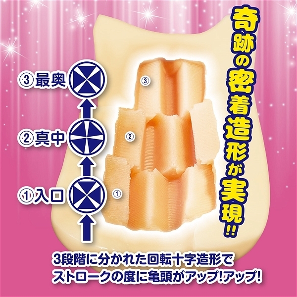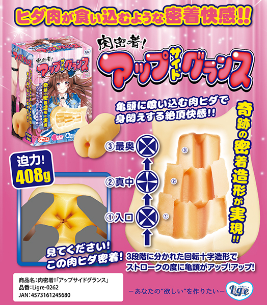 完全密着!肉密着!「アップサイドグランス」の登場です!見て下さい!この肉密着!ほとんど隙間がないぐらいの奇跡の造形!入り口から十字、そして徐々に回転していき角度が変わる!そこを押し込むように挿入していく。 軌道がずれて快感が変わる!常にヒダ肉が食い込んでいるような密着快感!抜き時にはカリの部分に十字の回転肉密着ヒダが食い込む!気持ち良すぎて、もう手が止まらない!ストロークが止まらない!3段階に分かれた回転十字造形は、その度に亀頭がアップアップ!