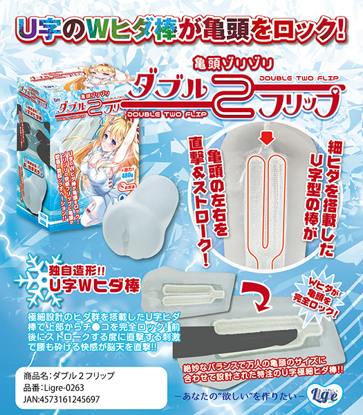 亀頭をダブルのヒダ棒が行き交う!亀頭ぞりぞり「ダブル2フリップ」の登場です!2つの細ヒダを搭載したヒダ棒。 亀頭の左右に直撃しながらストロークで、腰も砕ける快感が脳へほどばしる!足腰が立たなくなる程の鋭い快感を実現!前後ストロークするたび、背中が震える…最高の瞬殺オナホが登場!絶妙なバランスで万人の亀頭に合わした設計!480gの超肉厚で内部を極細設計により、2つのヒダ棒が亀頭を完全にロック!ズレない!もう逃げられない!滑りだしたら止まらない!感動の快感が今始まる!!