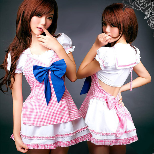 セーラー服とメイド服の最強コラボ!乙女心も男性のハートも掴んじゃうメイドコスチューム。 ●白×ピンクのセーラーワンピース●背中部分はソフトな伸縮素材●後ろから見るとセパレートになるドキドキ仕様●ギンガムチェック×青いリボンのキャミ風エプロン●ホルターネックとウエストを後ろで結ぶフリーサイズ。 キャミソール単体でセクシーに、ワンピース単体でシンプルに、二つあわせて最強コーデにと3WAY楽しめる嬉しい仕掛け!前と後ろで印象がガラリと変わるセーラー風メイド服です。