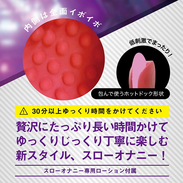 時間を掛けて限界を超える。 スローオナニー専用オナホール「ズリセン」!あなたは、「スローオナニー」という言葉を知っていますか?贅沢にたっぷり長い時間をかけて、ゆっくりじっくり丁寧にプレイを楽しむ、それがスローオナニー。 「ズリセン」は、そんな新しいプレイスタイルのために生まれたオナホールです。 挟み込むホットドッグ形状と、まったり刺激とで、スローオナニーをサポートします。 貴男をパックリと挟んで包むホットドッグのパンズような形状が特徴的です。 通常のオナホールにある挿入行為が不要で挟むんでコスるだけで楽しめるのでビンビン状態でなくても使用可能。 半ビン状態から優しいアプローチで、ゆっくりと気分を高めることが出来るのです。 長い時間を楽しめるよう、まったりとした刺激も特徴的。 最初は優しくスリスリ、盛り上がってきたら裏をズルズル、さらに高まってきたら頭をグリグリとまるで磨き上げるようにじっくり楽しめます。 焦らすようにジワジワと快感を貯め込むことでフィニッシュ快感は遥かな高みに到達するはず。 すぐにフィニッシュを求めず、そこに至るまでの刺激を楽しみ続け、より深い快感を目指す贅沢な流儀。 それが新しいスタイル、スローオナニーなのです。 強い刺激やビンビン持続も必要ないので、「早さ」や「タフさ」のトレーニングにも!?「イボ」は、大きなイボイボ突起がびっしり配置されたデコボコ快感。 弾力たっぷりな肉感素材。 クリアカラーに包まれたビビッドなレッドカラーが絶妙な高級感を演出。 手コキと相性ぴったりなツブツブのまったり刺激をお楽しみください。