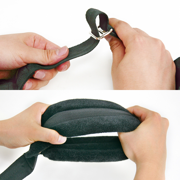 肌を痛めないようソフトな素材で作られ、体重の負荷を軽減させるため肉厚に仕立ててあり、縄で拘束するよりも負担が少ない簡易拘束具です。