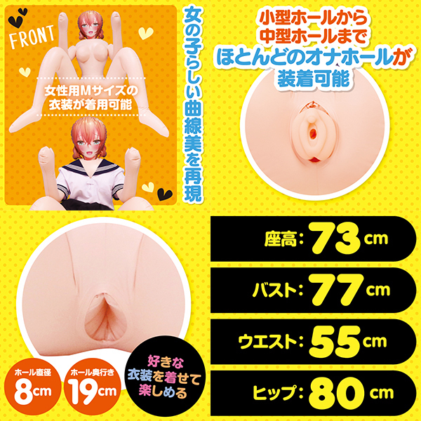 アニメチックな彼女召し上がれ?抱きしめたくなるキューティーBODY 萌え系エアドールの決定版!可愛らしい2次元プリントエアドールは抱き心地抜群!女の子らしい曲線美を再現し女性用Mサイズの衣装が着用可能のため好きな衣装を着せて楽しめる!ハメやすい究極のポージングは対面立位や正常位がしやすい実用的なデザイン。 小型ホールから中型ホールまでほとんどのオナホールが装着可能。 イラスト:どぅーゆーうぉんとぅー●メーカー型番:TMT-1605 ※衣装は付属しておりません。