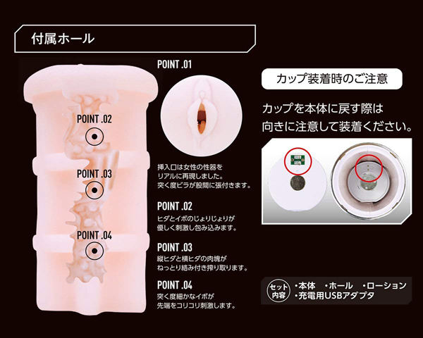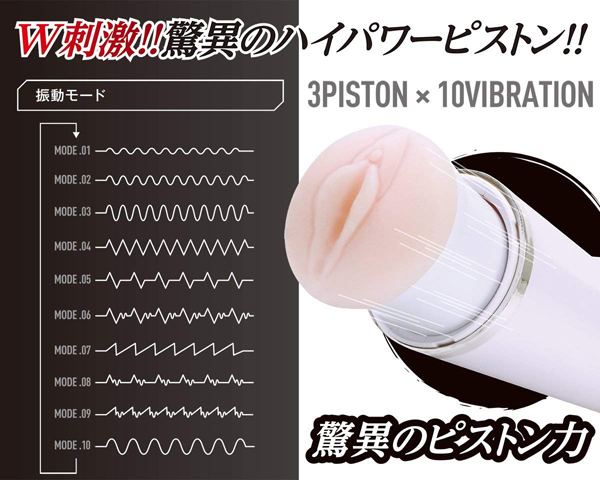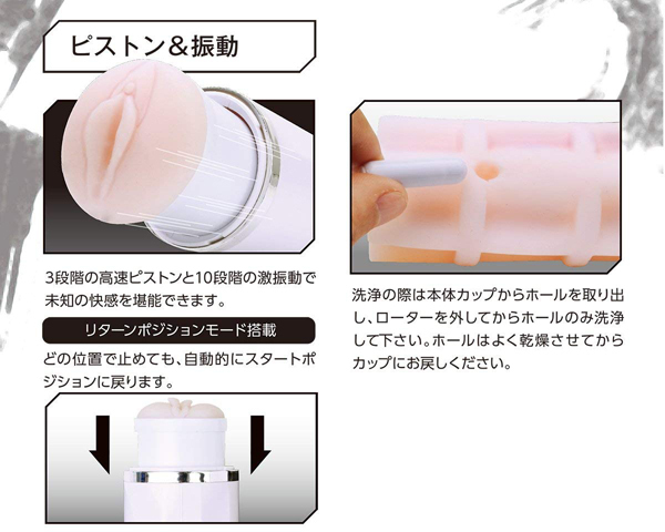 握力いらずで快感に集中できる、驚異のハイパワーを実現したピストンオナホ!ダブルの刺激とハイパワーが自慢のピストンモードを搭載したカップ型の電動オナホは他に類を見ません♪3段階の高速ピストンと10段階もの激振動で、これまでにない未知の快感を体感できます!本体上部の空洞部分には親指を通して固定できるので、握力をさほど使わずに使用可能。 付属のホールはリアルな形状で、挿入口付近はヒダとイボのジョリジョリが貴男の息子を優しく刺激♪縦ヒダと横ヒダの肉塊とねっとり絡みつく快感、突く度に先端を襲うイボによるコリコリ刺激がたまりません!ご使用後はホールを取り外して洗浄可能♪電源はUSB充電式で、4時間の充電で約40分の連続使用が可能です。