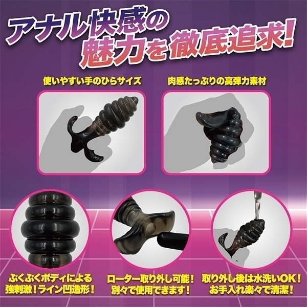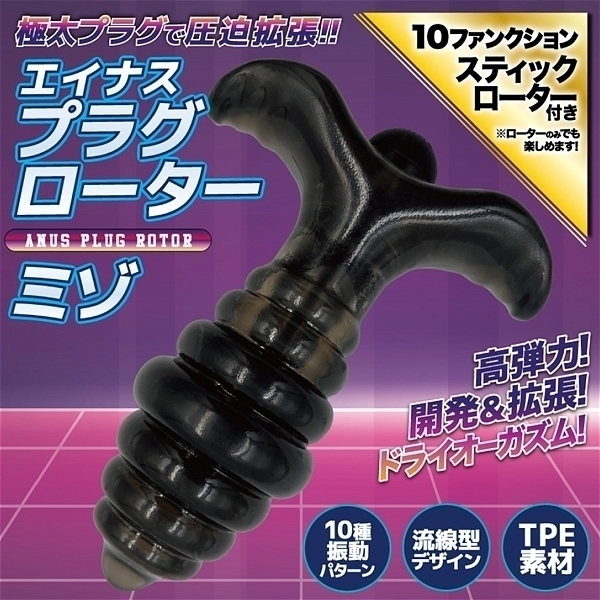開発!拡張!圧迫!アナル快感の魅力を徹底追求!アナルプラグに振動10アクションをプラスした、「エイナスプラグローター」!オンオフできるよう取り外し可能なスティックローターで、振動アクション10パターンを搭載。 ローターを取り外せば、本体は丸々水洗いが可能。 肉感たっぷりで高弾力なTPE素材を使用。 「ANUS」の名の通り、ファンタスティックな快感をご体験ください。 ●ミゾタイプ