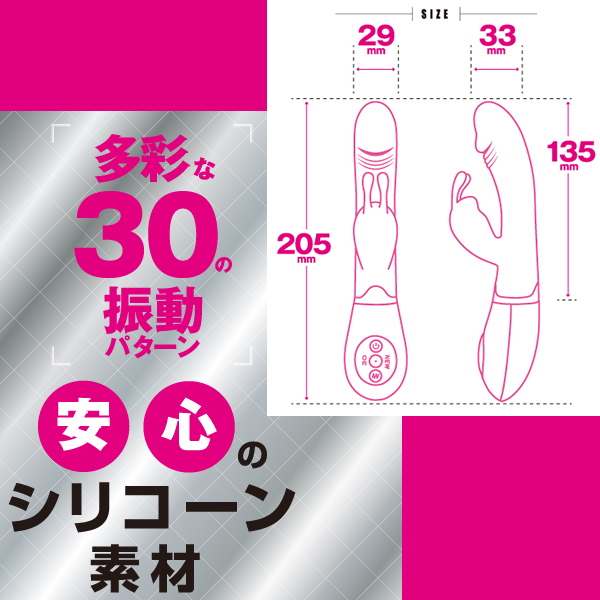 小型バイブにも先端モーターを搭載!クリトリスもしっかり刺激するダブルモーターを搭載した「ダブルモーターバイブ」。 大きすぎず小さすぎずなちょうど良いサイズ感で2点責めの王道タイプ!単四電池2本で駆動するバイブで30種類もの豊富なパターンで飽きずに振動刺激を体感できます♪挿入シャフトは先端が亀頭のような形状で素材にはシリコンを採用!挿入フィーリングも悪くなく、モーター内蔵の子機はウサ耳タイプとなっておりますのでクリへの刺激もダイレクトに楽しめます♪