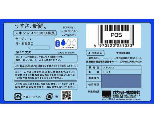 もっとナチュラルな装着感を!ユーザーの熱い声に応え、大手メーカー「オカモト」社が作り上げた、薄くてやわらかな質感が特徴的なコンドーム(12個入り)。 スキン(皮膜)+レス(〜のない)の名の通り、スキンがあることを感じさせない薄さでパートナーの温もりや感触もリアルに感じられ、プレイが燃え上がること間違いなし!表裏のわかりやすい加工も嬉しい、爽やかなグリーンのコンドームです。
