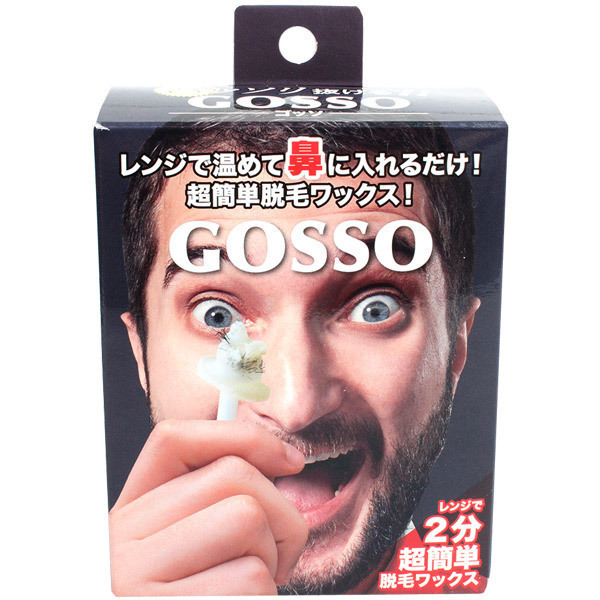 鼻毛処理に新革命!ゴッソリ抜ける最強の鼻用脱毛ワックス「GOSSO(ゴッソ)10回分キット」。 ●一気に抜ける超簡単な鼻毛脱毛セット●レンジで温めて鼻に入れるだけ●ブラジリアンワックス(40g)●専用スティック20本(両鼻10回分)●耐熱カップ1個・紙カップ3個●取扱い説明書付属。 気になる鼻毛と一瞬でオサラバ!美容業界で大注目のブラジリアンワックス脱毛を取り入れた鼻毛処理グッズ。 使い方は耐熱カップの中に水を入れ、その上から紙カップを入れてワックスをレンジで温め、スティック先端に溶かしたワックスを適量巻きつけたら鼻にイン!完全に固まったら引き抜くだけという簡単仕様。 スティックの約1cm部分にはストッパーが付いているので必要な鼻深部の鼻毛はそのまま残せます。 ポイントは躊躇せず一気に引き抜くこと!真下に勢いよく引き抜くことで痛みも最低限に抑えられます。 残ったワックスはフタを閉めて保管可能です。