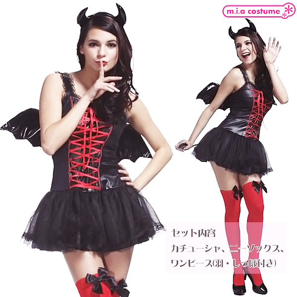 Ladiesサイズ:B〜90cm・W〜70cm・H〜96cm・身長155〜165cm・着丈80cm セット内容:カチューシャ、ワンピース(羽、しっぽ付き、背面ファスナー)、ニーソックス 素材:ポリエステル100%