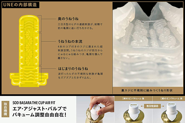 無段階に空気調整ができる新機構エアアジャストバルブを搭載した「SOD BASARA」シリーズ!奥行12.5cmと奥突きできる独自設計で、素材には包み込まれるように気持ちいい最高級ウレタン採用。