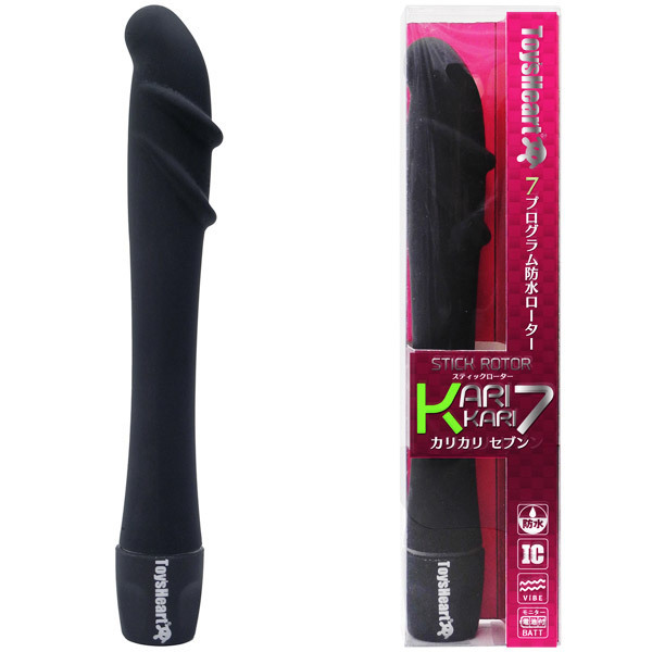 あの有名なアダルトグッズ社「トイズハート」から発売された、防水のスティック型ローター「カリカリセブン」。 本体の挿入部・グリップ部に、マットコート素材を採用!長めのスリムボディには、7パターンの振動と連動するイルミネーションを搭載!先端がクイっと曲がっているので、Gスポットやその他の性感帯をピンポイントで刺激!また、背側の突起で内部をしっかり擦ることも可能なので、想像以上の高刺激が期待できます。 シンプルな見た目なのに、強力振動を発揮する防水仕様のスティック型ローターです。 単三電池×2本付属。