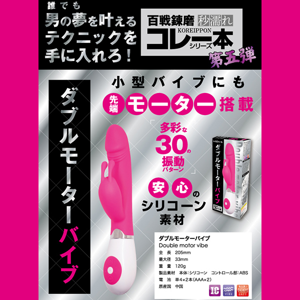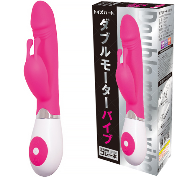 小型バイブにも先端モーターを搭載!クリトリスもしっかり刺激するダブルモーターを搭載した「ダブルモーターバイブ」。 大きすぎず小さすぎずなちょうど良いサイズ感で2点責めの王道タイプ!単四電池2本で駆動するバイブで30種類もの豊富なパターンで飽きずに振動刺激を体感できます♪挿入シャフトは先端が亀頭のような形状で素材にはシリコンを採用!挿入フィーリングも悪くなく、モーター内蔵の子機はウサ耳タイプとなっておりますのでクリへの刺激もダイレクトに楽しめます♪